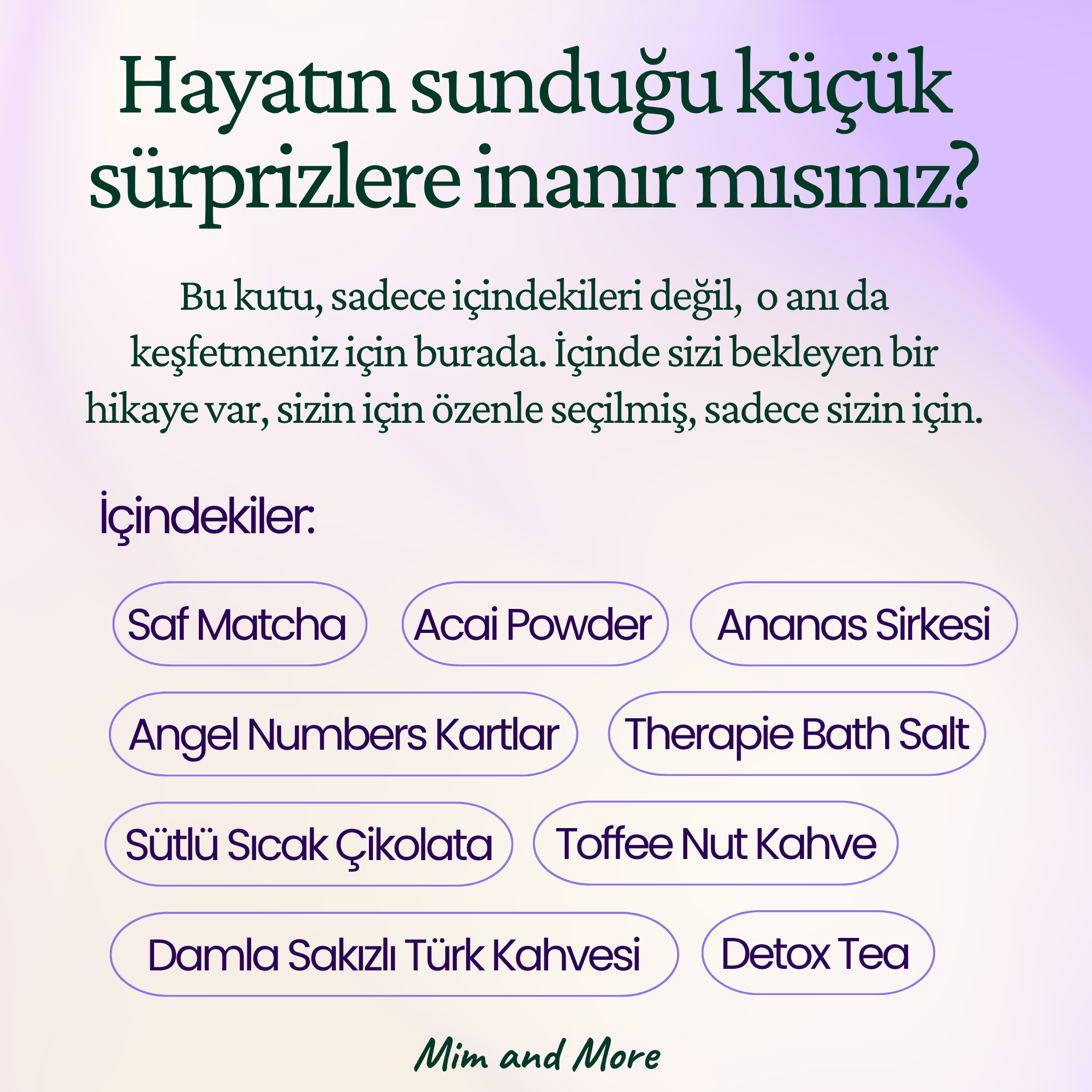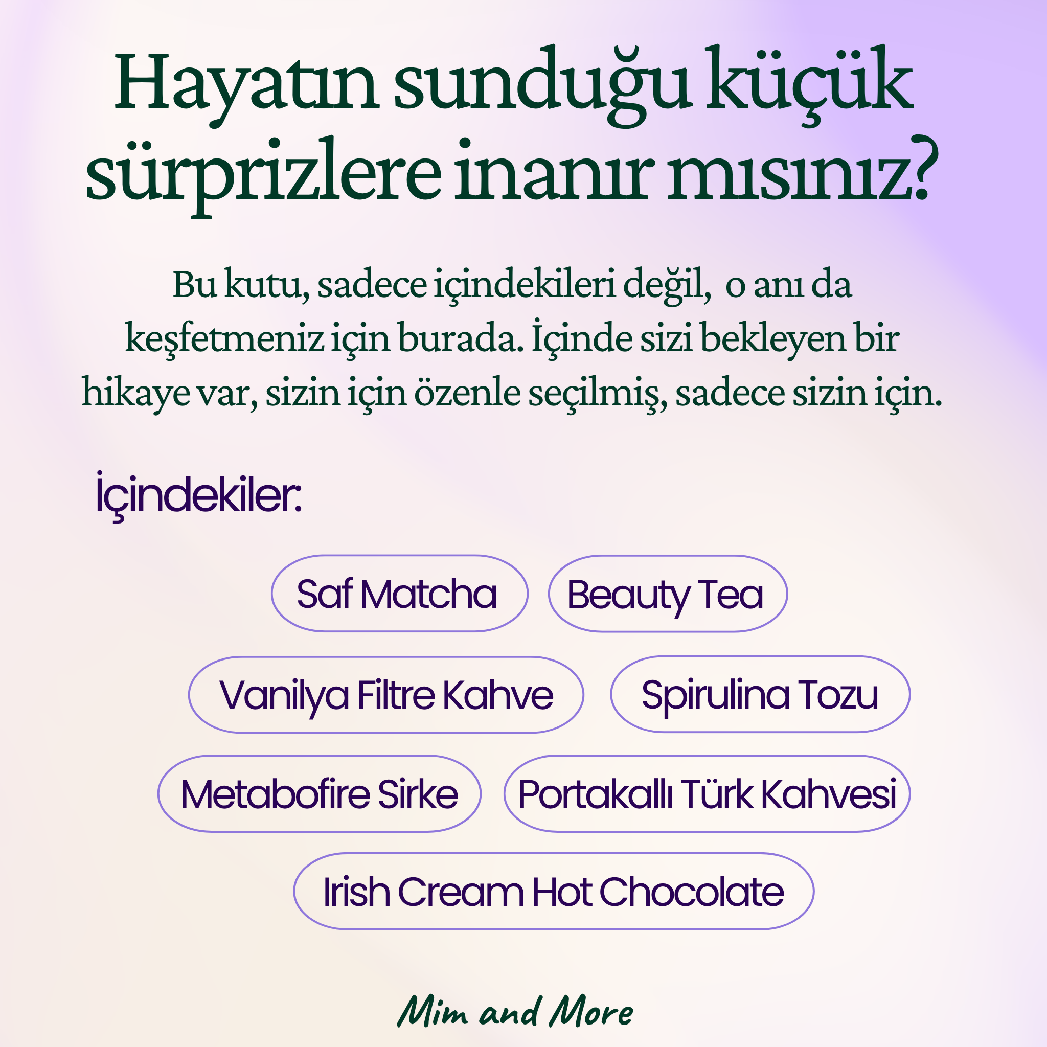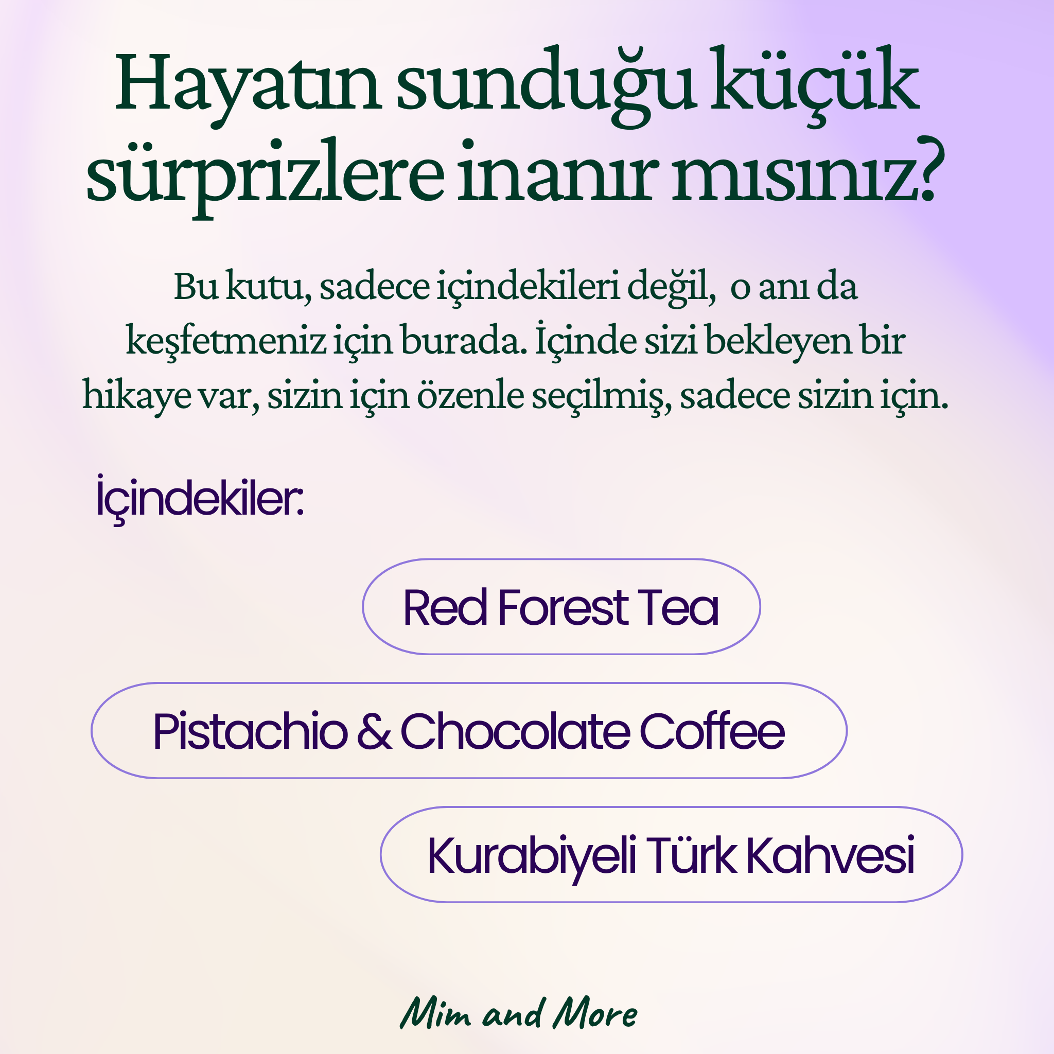 Mim and More firması özel olarak hazırladığımız reçetelerimiz ve kendi harmanladığımız çaylarımız ile birlikte sizlere eşsiz deneyimler ve lezzetler sunmak için her gün daha fazla özveriyle birlikte firmamızı büyütmeye ve ilklere imza atmaya devam ediyoruz.