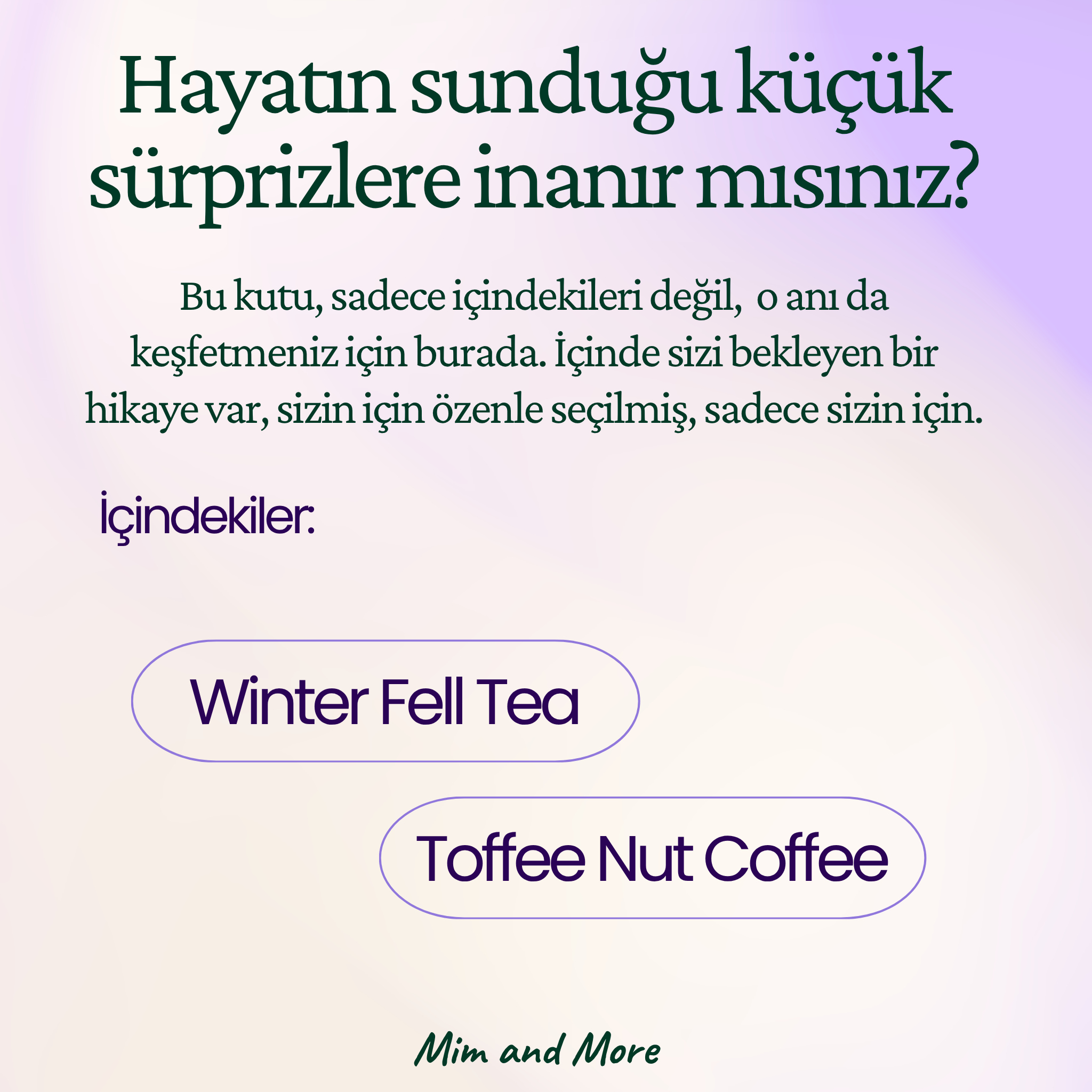 Mim and More firması özel olarak hazırladığımız reçetelerimiz ve kendi harmanladığımız çaylarımız ile birlikte sizlere eşsiz deneyimler ve lezzetler sunmak için her gün daha fazla özveriyle birlikte firmamızı büyütmeye ve ilklere imza atmaya devam ediyoruz.