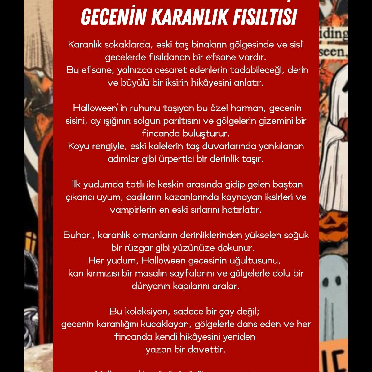 Balkabağı aroması, sadece Cadılar Bayramı’nın değil, tüm sonbaharın vazgeçilmez tatlarından biridir. Bu tat, sıcak baharatlarla birleşerek hem huzur verir hem de nostaljik bir his uyandırır. Halloween Collection, bu büyüleyici aromayı çay ve kahve ürünlerinde sunarak, hem damak tadınızı hem de Cadılar Bayramı deneyiminizi zenginleştiriyor.