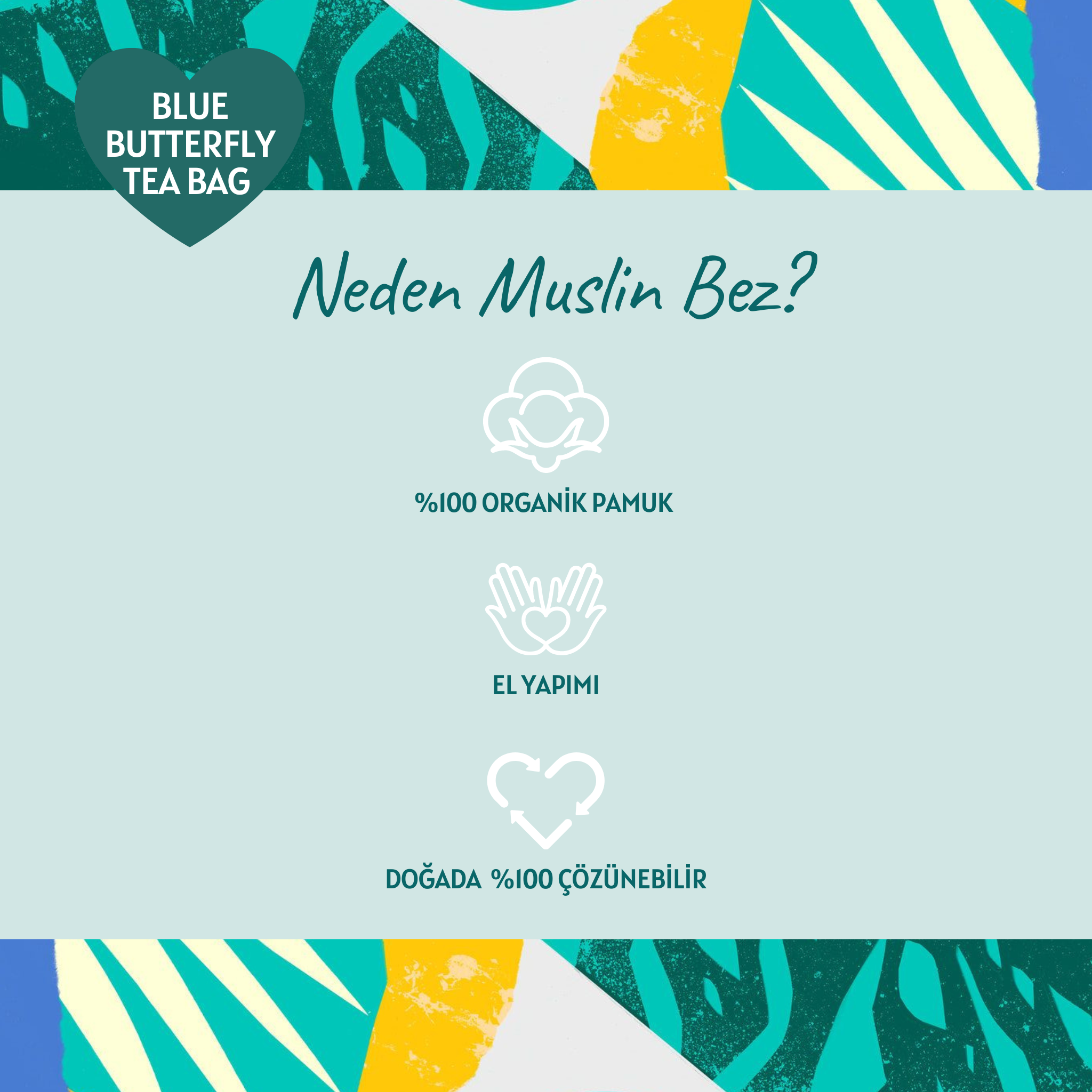 İşlem görmemiş ham pamuktan yapılan müslin çay poşetlerinin hepsi el yapımıdır ve en üst kalitedeki dökme çayların bu doğal pamuklu kumaşların içine doldurulması ile elde edilir.