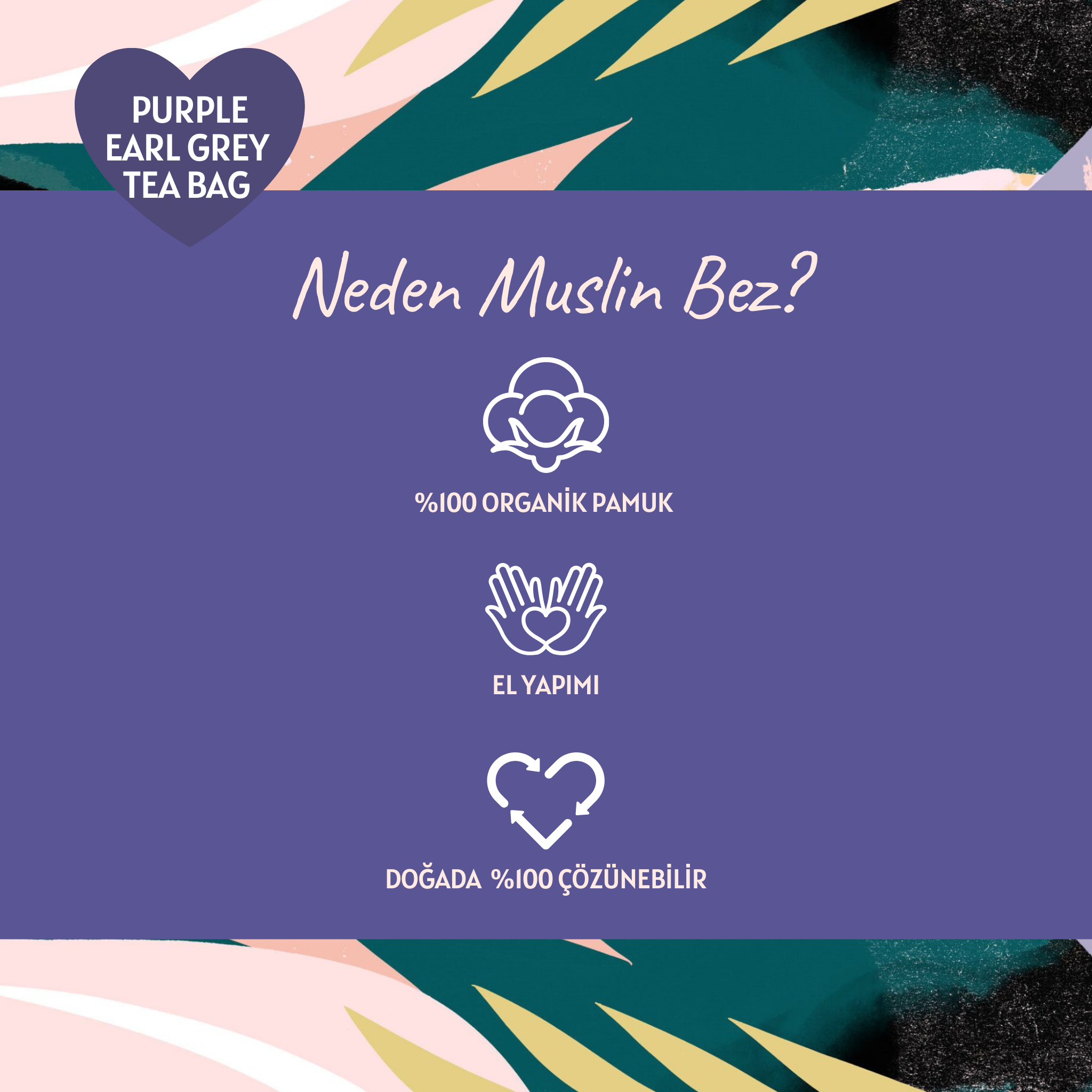 İşlem görmemiş ham pamuktan yapılan müslin çay poşetlerinin hepsi el yapımıdır ve en üst kalitedeki dökme çayların bu doğal pamuklu kumaşların içine doldurulması ile elde edilir.