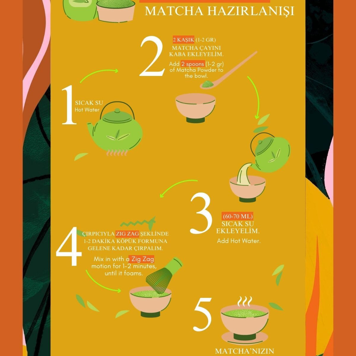 Matcha'yı içeceklerinizde kullanmadan önce sıcak su ve çırpıcı ile açmanız gerekmektedir fakat isterseniz matchayı sıcak su ile hazırladıktan sonra soğuk içecek ürünlerinize ekleyebilirsiniz.