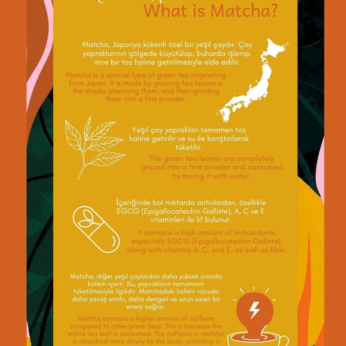 Matcha çayı faydaları nedeni ile Japonyada sıklıkla kullanılan bir çaydır. Vücudu tehlikeli serbest radikallerden koruyan kateşin denilen güçlü antioksidanlar içerir.