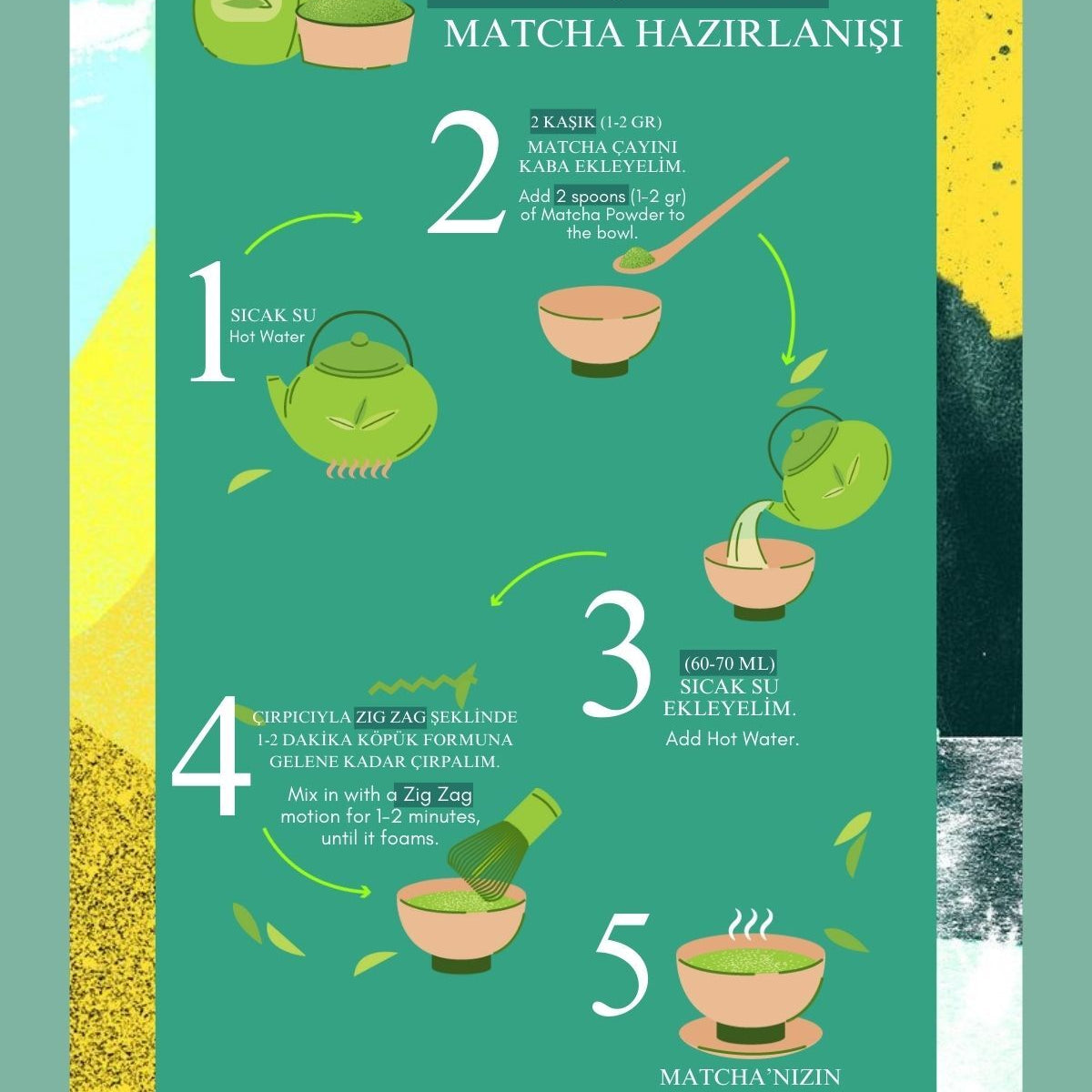 Matcha'yı içeceklerinizde kullanmadan önce sıcak su ve çırpıcı ile açmanız gerekmektedir fakat isterseniz matchayı sıcak su ile hazırladıktan sonra soğuk içecek ürünlerinize ekleyebilirsiniz.