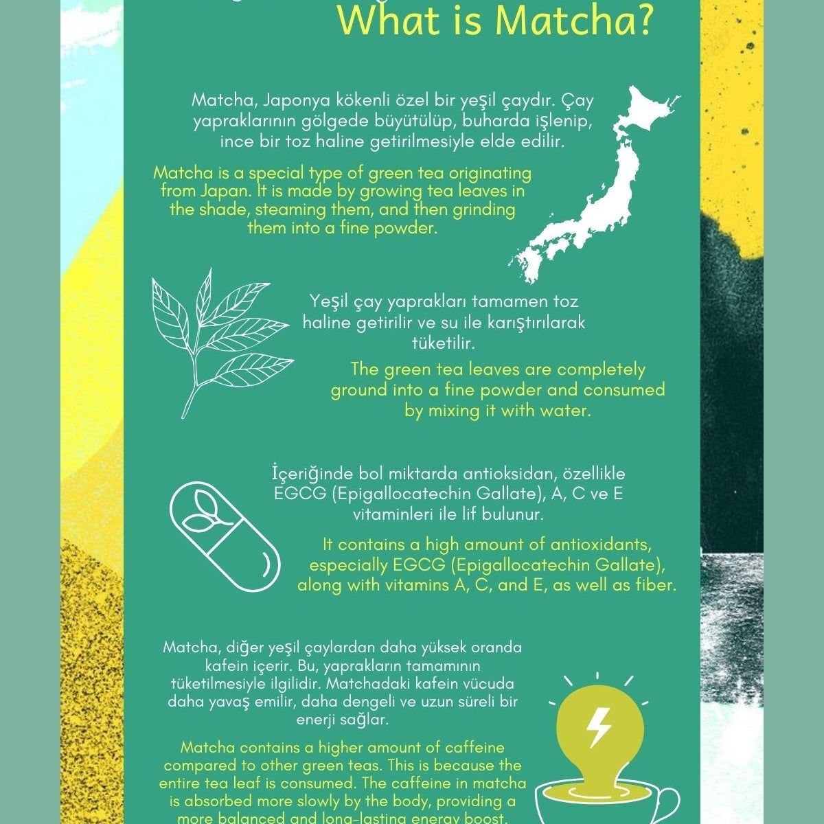 Matcha çayı faydaları nedeni ile Japonyada sıklıkla kullanılan bir çaydır. Vücudu tehlikeli serbest radikallerden koruyan kateşin denilen güçlü antioksidanlar içerir.